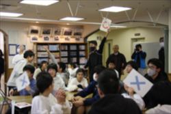 「高特クイズ」 〇と×のシートを各チームに配布。25問出題します。 チームで話し合い〇か×を決め、リーダーがシートをあげます。