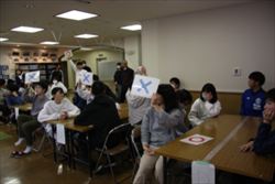 チームで話し合い〇か×を決め、リーダーがシートをあげます。