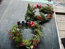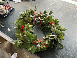 リース土台に葉・実をワイヤーで巻き付けていき、 最後に木の実やクリスマスオーナメントを飾りました!