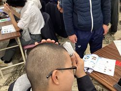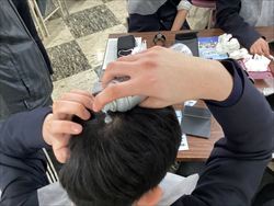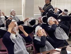 その後、男子はスキンケアの説明を受け、フェイスパックや頭皮ケア、 ヘアセットの体験をしました。