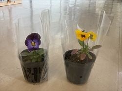 生徒が作業学習で制作した鉢植えやコースターなどの記念品紹介が行われました。