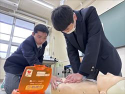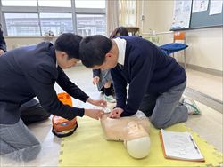 保健の授業の一環として「心肺蘇生法」の実技講習を行いました。 前回の授業では、座学で心肺蘇生法の必要性や具体的な手順について学習しました。 「なぜ心肺蘇生が必要なのか」「どのような流れで行うのか」命を守る行動の意味を、 一つひとつ丁寧に確認しました。 実技講習では、実際の場面を想定しながら、胸骨圧迫や周囲への助けの求め方などを 体験しました。 生徒たちは緊張した表情を見せながらも、真剣なまなざしで取り組んでいました。![]()