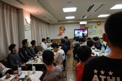 自治会長の乾杯(麦茶)の音頭で「お別れ会」が始まります。 「卒業生のみなさんのご健闘を祈って乾杯!」 夕食は特注弁当、 デザートはイチゴのミルキィーショコラ(ケーキ)とカルピスウォーターでした。