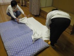 初めて布団にシーツをつける人もいます。先輩が丁寧に教えてくれました。