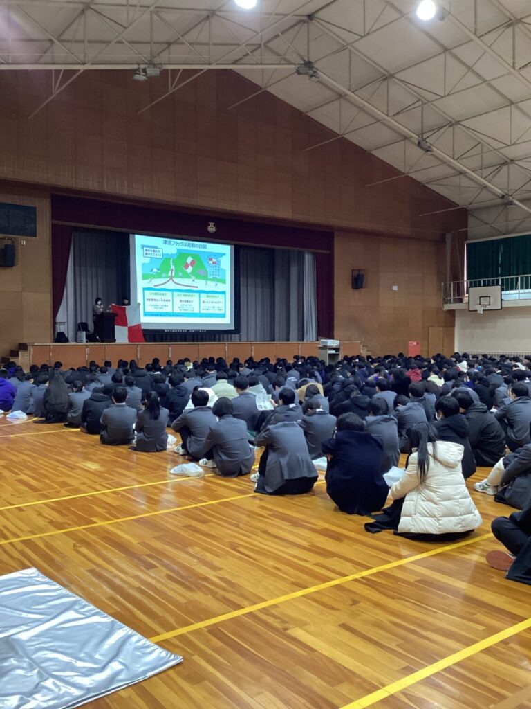 近い将来起こるとされている南海トラフ地震の想定される被害の影響や、地震から命を守ったり、被害を減らすためにできることを詳しくお話いただき、自分たちの防災意識や災害対策について改めて考える機会となりました。自分や周囲の人の命を守るため、いつ起こるかわからない自然災害に対して日ごろからできることを考え、行動できるようにしたいと感じました。
