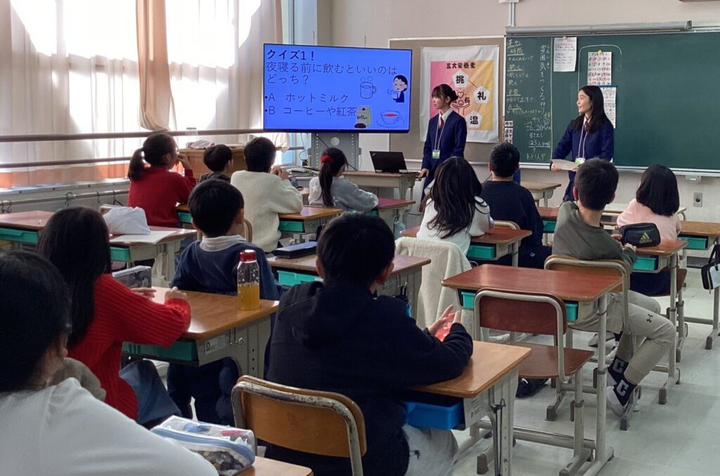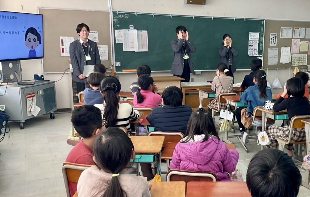 12月15日(月)、1年生・2年生の保健委員や希望者で苦楽園小学校に伺い、出前保健指導を行いました。「運動」「睡眠」「目の健康」の3つのグループに分かれて、15分の保健指導を行いました。小学生によりわかりやすく伝わる内容を考えたり、ゲームやクイズ、体操などを取り入れるなど、それぞれのグループで工夫しながら作った保健指導を行い、小学生とも交流できた貴重な時間となりました。