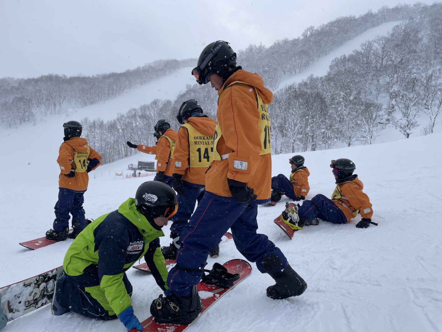 粉雪の中、2時間の実習が終わりました。インストラクターさんに板の履き方や転び方など、基本からしっかり教えていただきました!