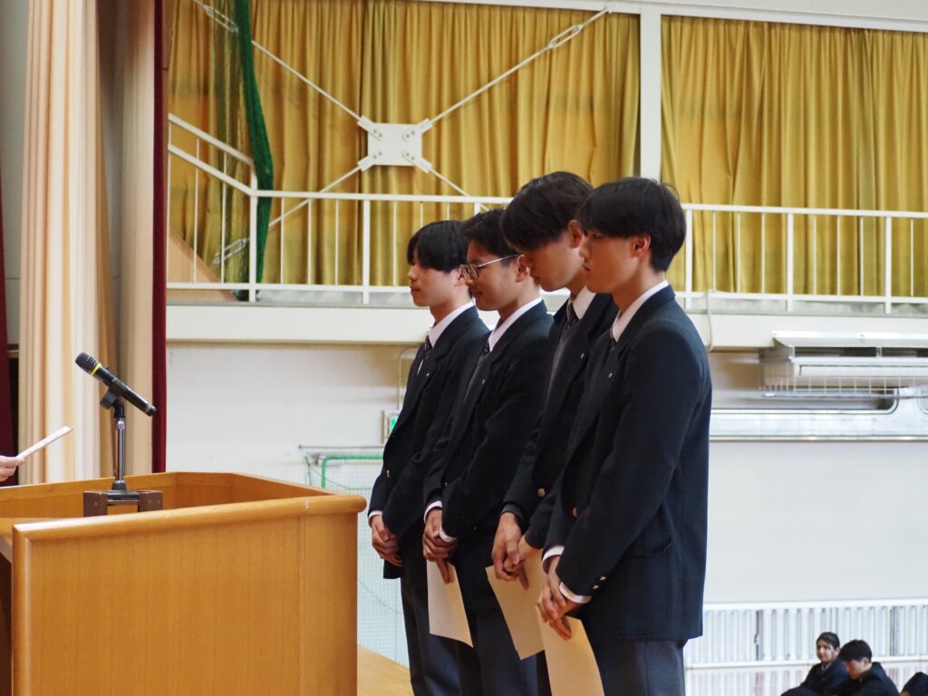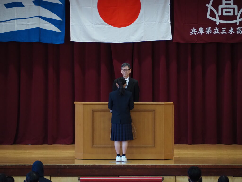 表彰伝達式では、水泳部員の東播地区高等学校春季記録会、上位入賞者が表彰されました。