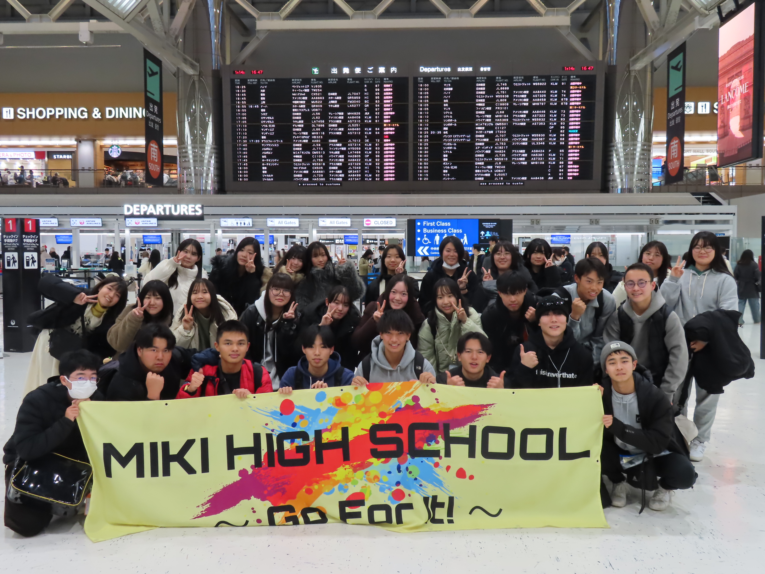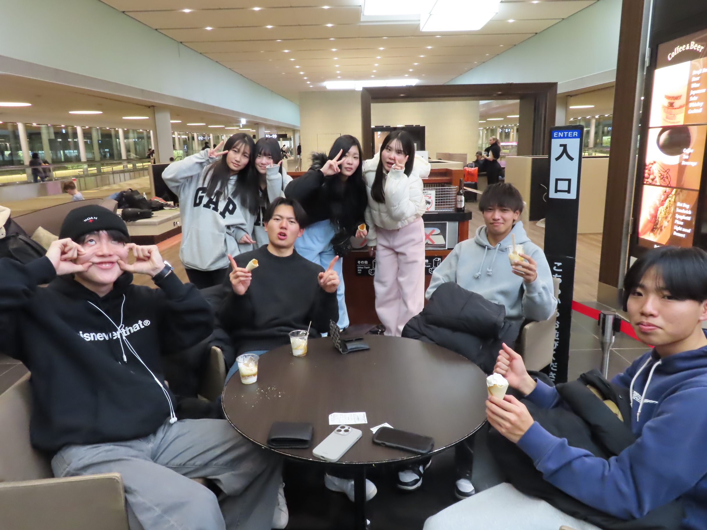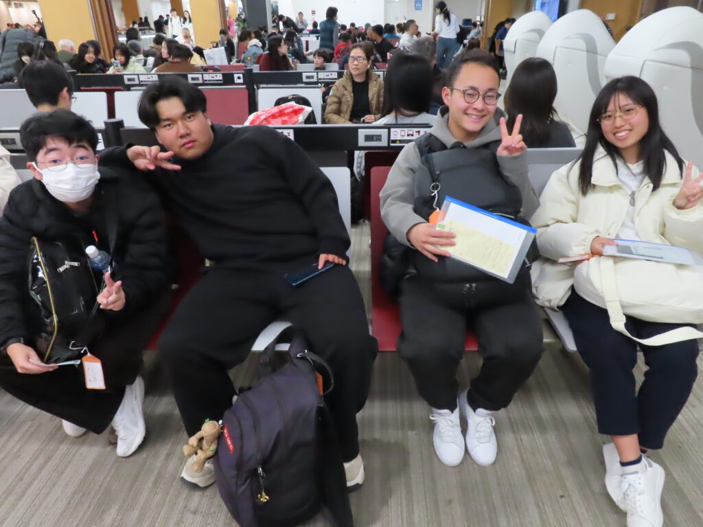 On the bus, the nervous excitement continued as we traveled to Itami Airport for our afternoon flight to Narita Airport, and the connection went smoothly. Everyone enjoyed the time together and there were many smiles, as they engaged all the different foods available in the airport food courts. One student, who could not join us, took part by smartphone and joined our group selfie, making the moment even more special. What a great start to what is sure to be an incredible trip.