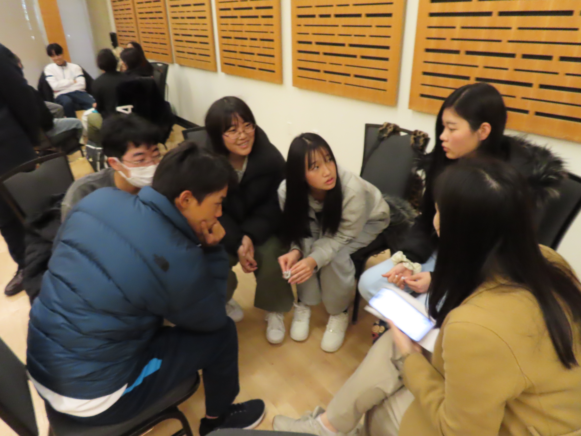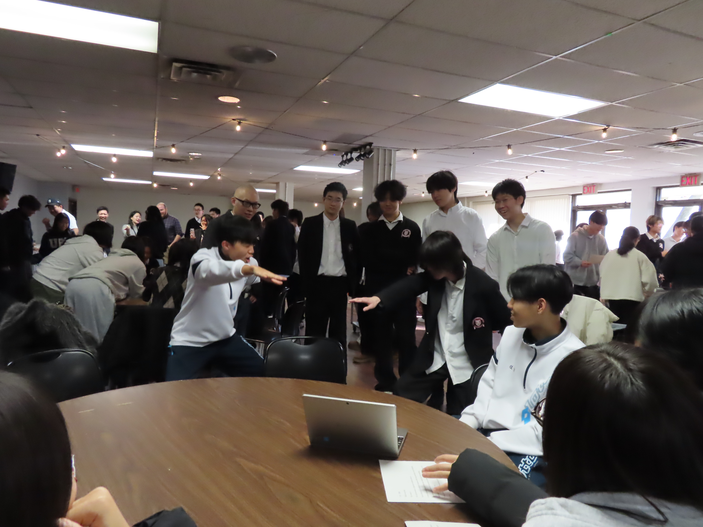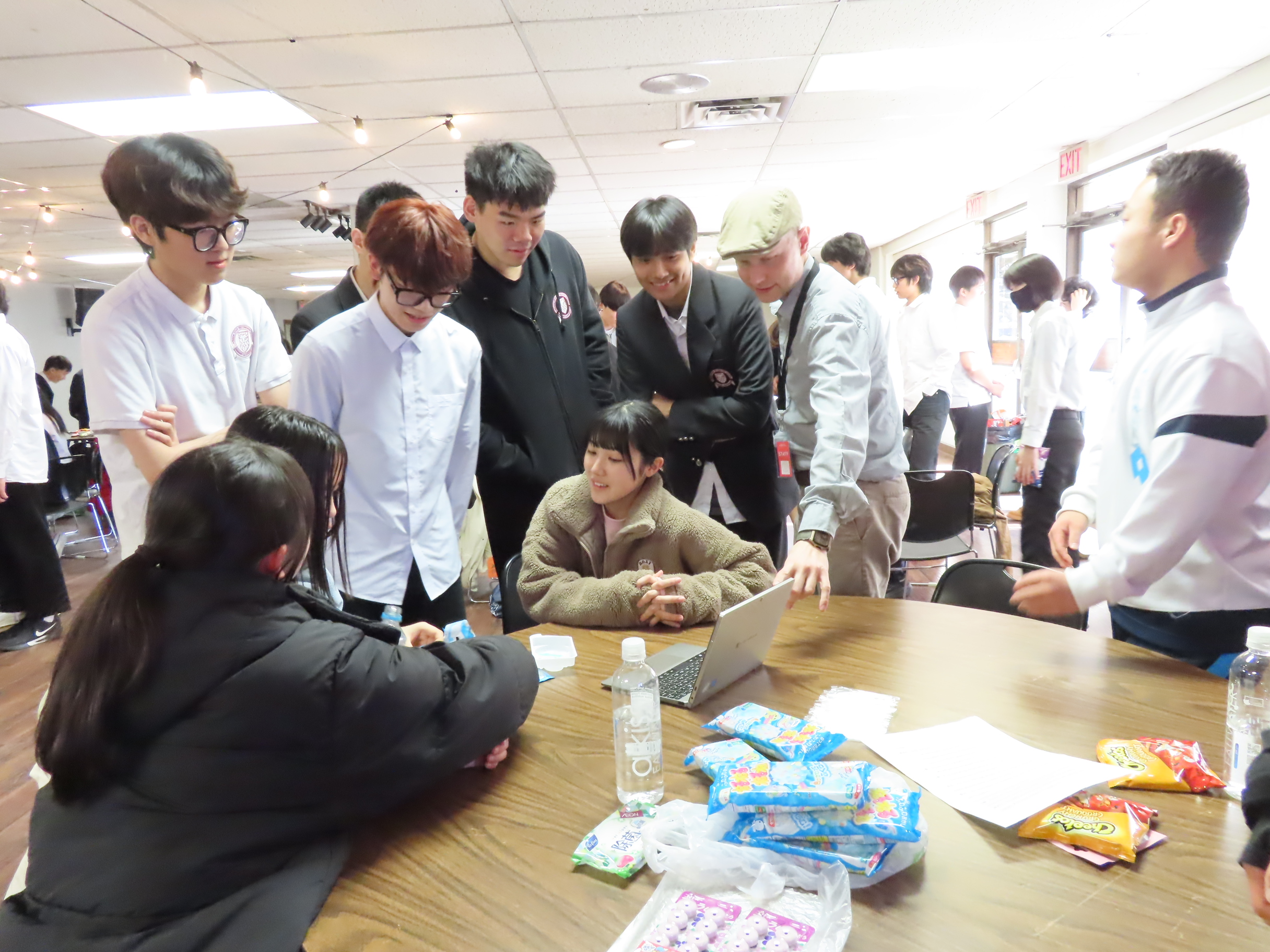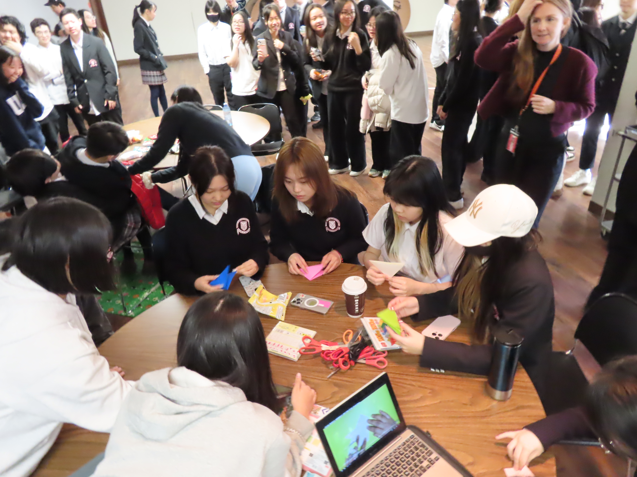 Our visit to CSSS began with a heartfelt welcome. Each student received a magnet souvenir featuring positive “You are…” messages such as “You are capable,” “You are strong,” and “You are worthy.” Students received these messages warmly and thoughtfully asked about their meanings, showing kind curiosity and care. After introductions, students were guided to a welcoming, fireside styled space where they took part in group cultural exchanges. Japanese students introduced important cultural activities to their Canadian peers, and the excitement in the room was wonderful to see as students laughed, danced, played, and connected well. Activities such as Nininbaori, Karuta, and Origami were especially popular.