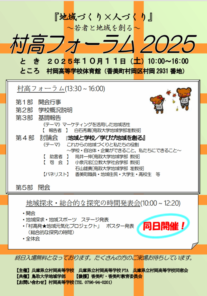 午後の「村高フォーラム」では、「これからの地域づくりと私たちの役割~学校・自治体・企業ができること、私たちにできること~」というテーマで討論会をいたします。 司会を立教大学教授の小泉元宏先生、鳥取大学准教授の石山雄貴先生、助言者に鳥取大学教授の筒井一伸先生、パネリストに香美町職員、地域住民、大学生(本校卒業生)等をお招きし、本校生徒も加わって討論します。