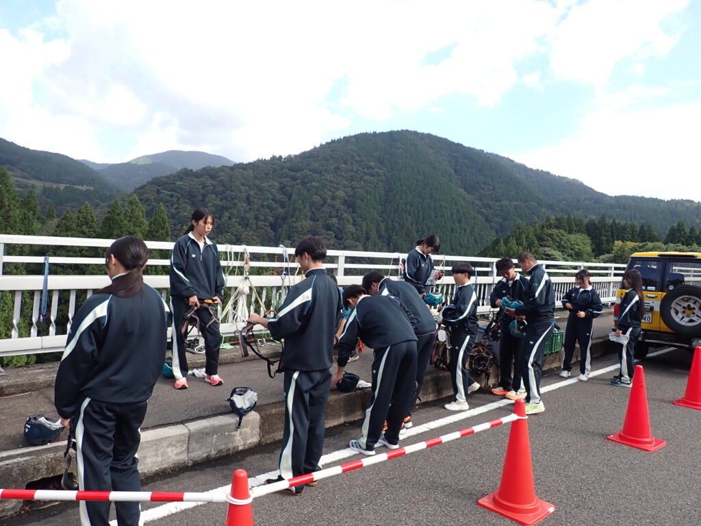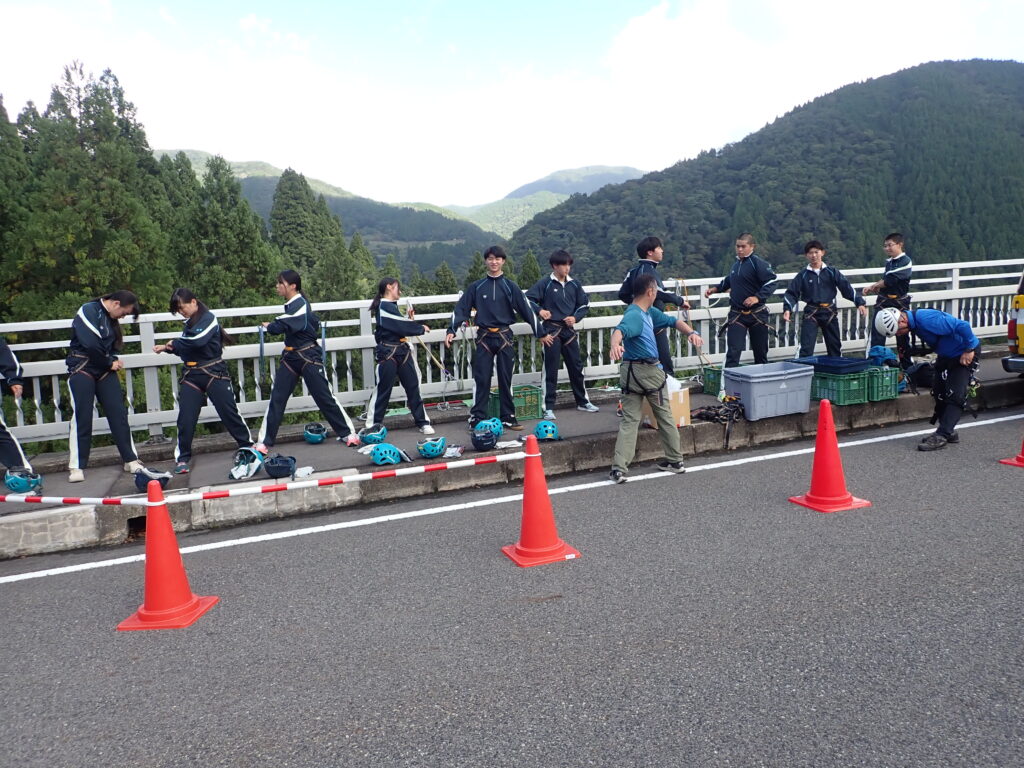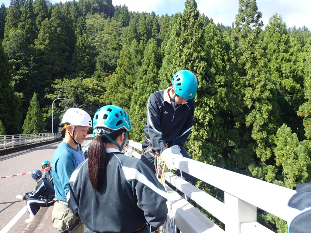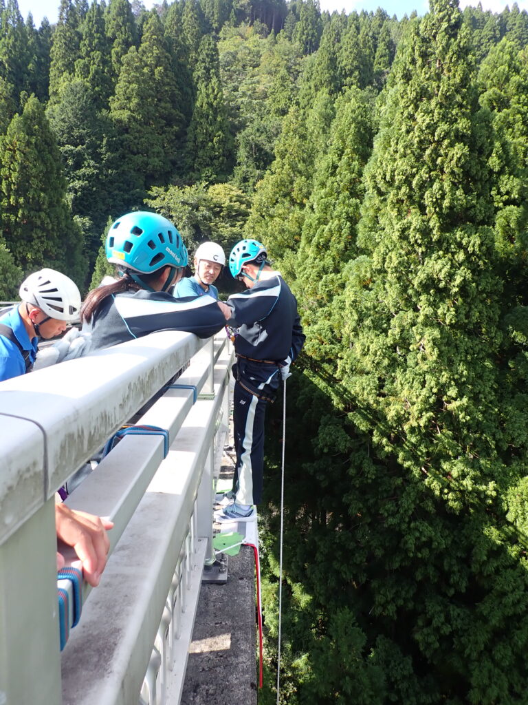 覚悟を決めて、アウトドアスポーツ系の生徒がチャレンジ!!ペアを組み、相手の装具を正しくつけ、授業担当者に必ず確認を求めます。とても真剣なまなざしです。生徒曰く、「自分たちの学びは命にかかわることも多いので、いつも一生懸命に学習しています。」とのこと。装具装着が完了したら充分注意して橋の防護柵をまたぎ、ゆっくりと降下。下を見ると地面が遠くに見えて恐怖心がでてきますが、全員無事にやり切りました!これで、また一回り大きく成長。