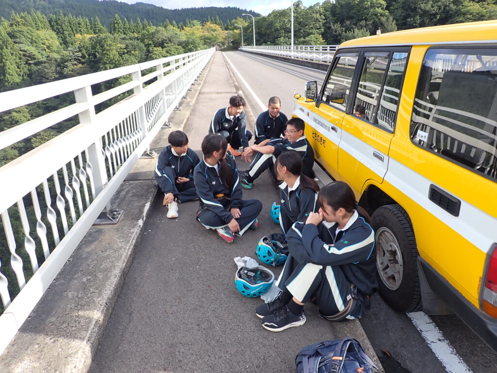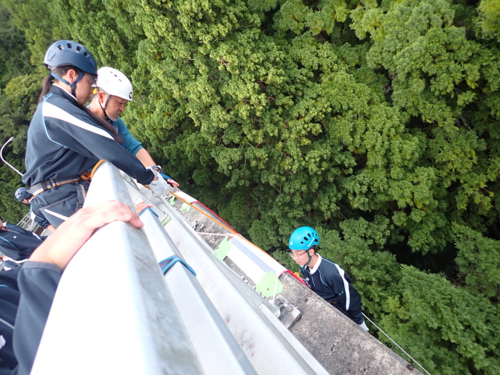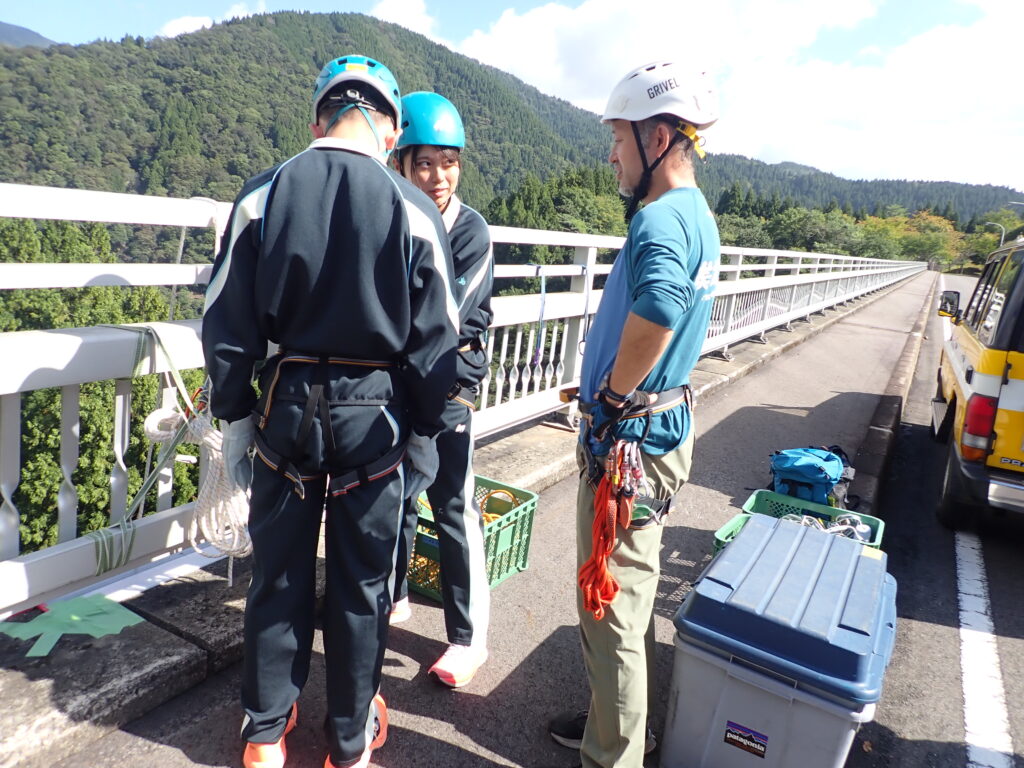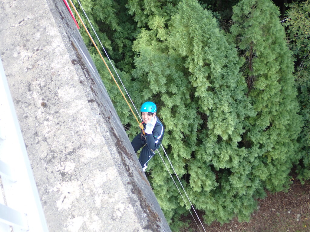覚悟を決めて、アウトドアスポーツ系の生徒がチャレンジ!!ペアを組み、相手の装具を正しくつけ、授業担当者に必ず確認を求めます。とても真剣なまなざしです。生徒曰く、「自分たちの学びは命にかかわることも多いので、いつも一生懸命に学習しています。」とのこと。装具装着が完了したら充分注意して橋の防護柵をまたぎ、ゆっくりと降下。下を見ると地面が遠くに見えて恐怖心がでてきますが、全員無事にやり切りました!これで、また一回り大きく成長。