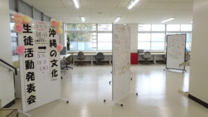 校舎内のピロティでは人権について調べたポスターの