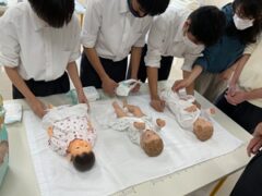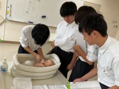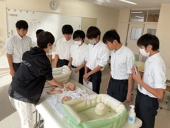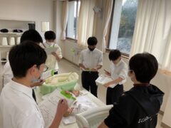 家庭科(保育分野)において、3年生を対象におむつ交換や沐浴の手順を、新生児と同じ大きさ(3kg)の人形を使用して実習を交えながら学びました。