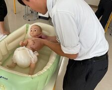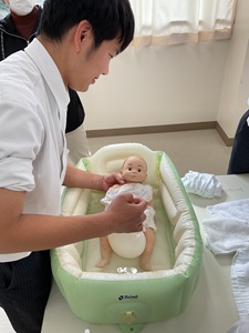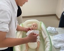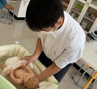 体験が始まると首がすわる前の新生児人形をおそるおそる抱きかかえて身体を洗ったり、慣れない手つきでおむつ交換したりと、不安な表情を見せながらも意欲的に取り組む姿が多く見受けられました。