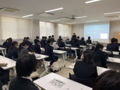 行事・活動報告12月4日(木)午前中、神戸芸術工科大学の大学4回生が大学の授業の一環で本校へ見学に来られました。最初に、本校の進路指導部長より学校概要説明(教育課程や進路指導システム)がありました。その後、2つのグループに分かれて、授業見学(校内の案内)をしました。1年生はワークや農園芸、2年生は座学を中心に、3年生はサテライトや座学の授業がありました。学生の皆さんは講義や見学を真剣なまなざしで聞いてくれていました。本校の見学が将来の何かのきっかけになっていただけると幸いです。