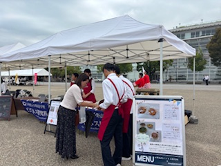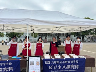 10月11日(土)に姫路大手前公園で開催された「商業教育フェア」にビジネス探究科1年生が出展しました。このイベントは毎年兵庫県高等学校商業教育協会の主催で行われているもので、今年は、県下で商業を学ぶ高校から12校が参加して、販売実習やワークショップを行いました。家族連れや外国人観光客の方など多くのお客様に購入していただくことができました。