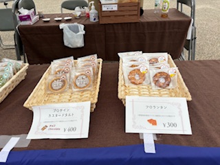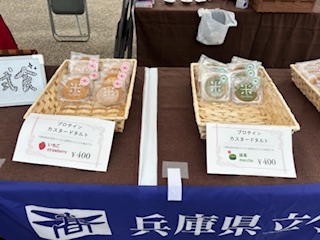 今年度の1年ビジネス基礎の授業では、6組が「平尾工務店」様と、7組が「小野福祉工場」様と産学連携しています。今回は、1年6組が規格外の玄米粉バームクーヘンを活用した商品を考案し、「プロテイン入りカスタードタルト」3種類と「バームのフロランタン」として販売しました。9月に六甲荘で販売した際の反省点をいかして、今回は製造工程の動画を流したり、試食していただけるように準備をして積極的に説明しながら販売するように心がけました。中には、外国人観光客のお客様もおられ、英語で質問された際にも、笑顔で英語で対応していました。その結果、完売することができ、開発商品や連携先の事業所様の認知度を高めることができたと思います。