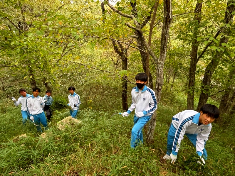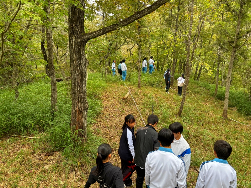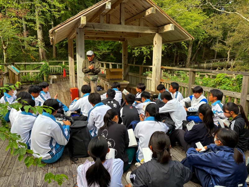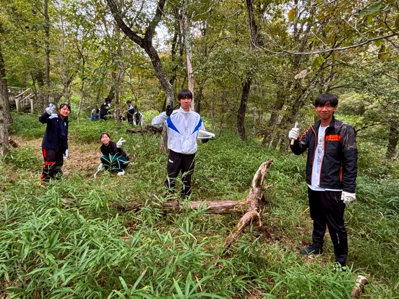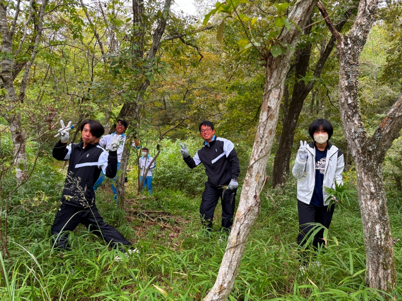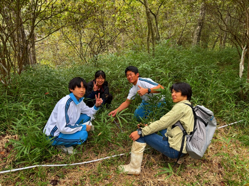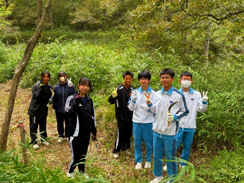 10/25(土) に2年5組科学探究科第2回やしろの森フィールドワーク実習を実施しました。講師の先生方の講義を聞いた後、ライントランセクト法による植生調査の仕方を学び、実際に実地研修を行いました。2年前の先輩たちが記録した情報を元に遷移がどのように変化しているのかを調査しました。また数年後には新しい花が咲いたり、秋の七草が再生することを目標にして全員で草刈りをしました。普段は見れないたくさんの植物に囲まれながら貴重な体験学習ができました。