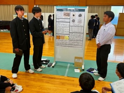 10月28日(火)の5・6限に、本校蜻蛉ホールにて、科学探究科2年生による「創造探究 中間発表会」が実施されました。科学探究科2年生は、授業「創造探究」において、4月から数名で班を組み、テーマを設定して実験や観察などの探究活動に取り組んでいます。今回は、約半年間の成果をポスターにまとめ、中間発表を行いました。当日は、科学探究科1年生や外部の先生方にもご来場いただき、多くの質問や貴重なアドバイスを頂戴しました。今回の経験を今後の探究活動に生かしていきます