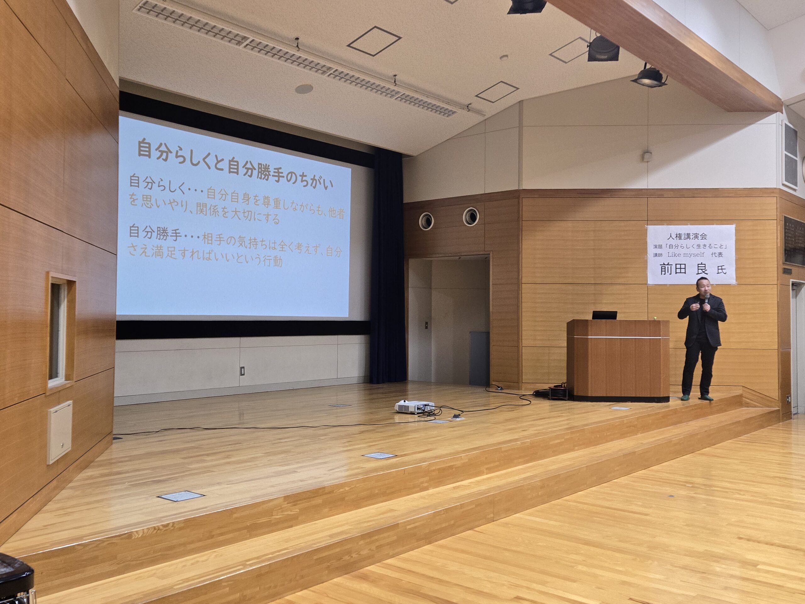 Like myself 代表の前田良先生を講師に迎え、「自分らしく生きること」について自身の経験をもとにお話をしていただきました。生徒たちは性別を超えた「個」として一人ひとりが認められること、また、自分らしさと自分勝手の違いについて考える良い機会となりました。講演終了後には、質疑応答が途絶えることなく続き、生徒たちの関心の高さがうかがえるとともに、なんでも気さくに答えていただける先生の優しさを感じました。