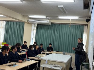11月13日(木)の3・4限に、2年生を対象とした類型特別講義を実施しました。「グローバルビジネス」類型では、JICA海外協力隊帰国隊員の山口まどか氏をお招きし、「JICAでの活動および語学研修」をテーマにご講義いただきました。講義では、スペイン語の基礎的な発音や日常で使われる簡単な会話表現を取り上げ、生徒たちは実際に声に出しながら学ぶことで、語学を身近に感じる機会となりました。また、現地での活動についても、写真やご自身の経験を交えながら丁寧に紹介していただき、現場で求められる姿勢などについて理解を深めることができました。