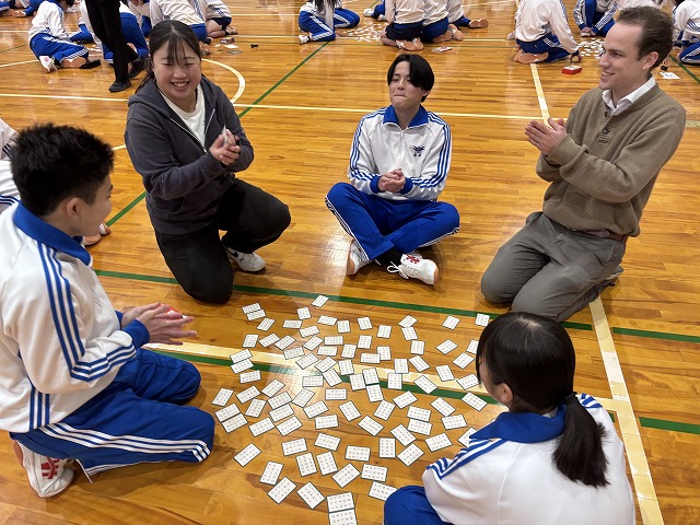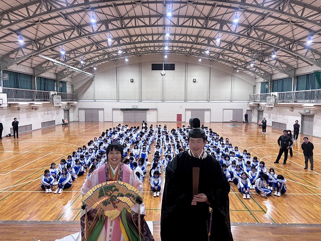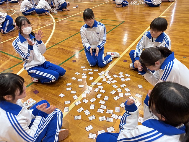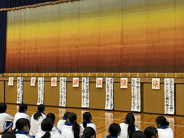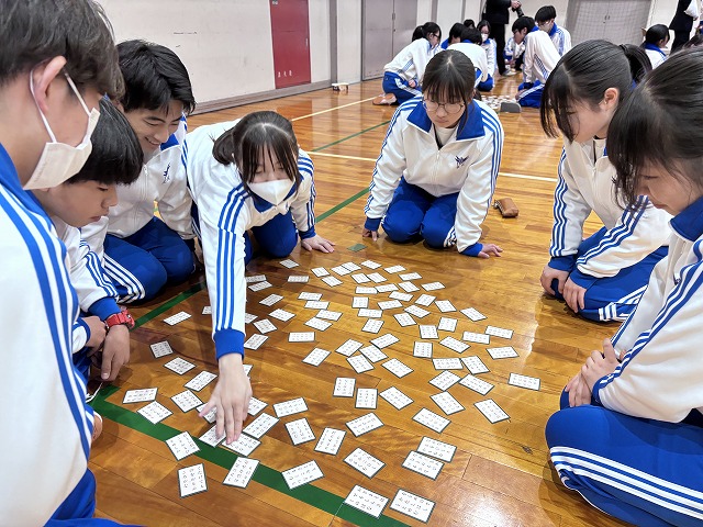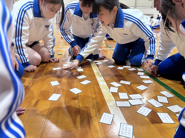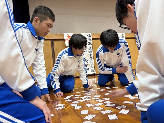 百人一首大会~蜻蛉杯~ではクラスごとの予選から始まり、白熱した取り合いを勝ち抜いた生徒たちが決勝へ進出。決勝戦で見事勝利した生徒は「名人」「クイーン」の称号が与えられます。名人とクイーンに選ばれた生徒は、その場で小野考古館の方々が衣冠束帯と十二単の着付けを披露してくださり、生徒たちは貴重な機会に真剣な眼差しを向けていました。真剣勝負の緊張感と笑顔あふれる和やかな時間が流れており、伝統文化の魅力を存分に感じられる大会となりました。