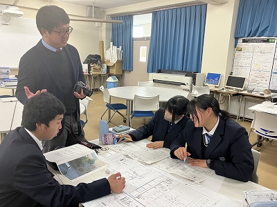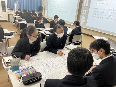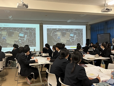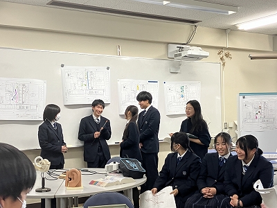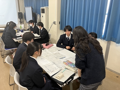 1月30日(金)、科学探究科1年生を対象に、日建設計デザイナーの村上小百合先生を講師としてお迎えし、ランドスケープデザインについての講義および演習を行っていただきました。ランドスケープデザインとは、公園や広場などに建築物を設ける際、地形や周辺の自然環境を踏まえ、その場所に調和するよう空間をデザインする考え方です。演習では、本校の中庭である「蜻蛉の庭」を題材に、ベンチの設置場所やその理由について班ごとに話し合いました。最後に、各班が考えたデザインを発表し、学びを深めました。