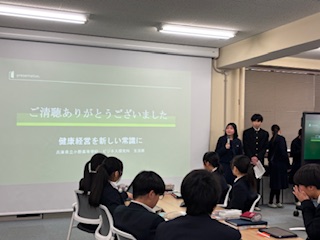 (生活班感想)健康経営というあまり馴染みのないテーマでも、どういうものかを詳しく説明し、どのような取り組みをしてきたかが、コンパクトに分かりやすくまとめられていたので、イメージが出来て分かりやすかったです。今まで制作した指標を見せて、どんなところを改善していたかが比較できて、最終的な指標ができた過程が知れて、なるほどと思いました。生活から健康に派生して、ビジネス探究科の要素も取り入れていてすごいと思いました。
