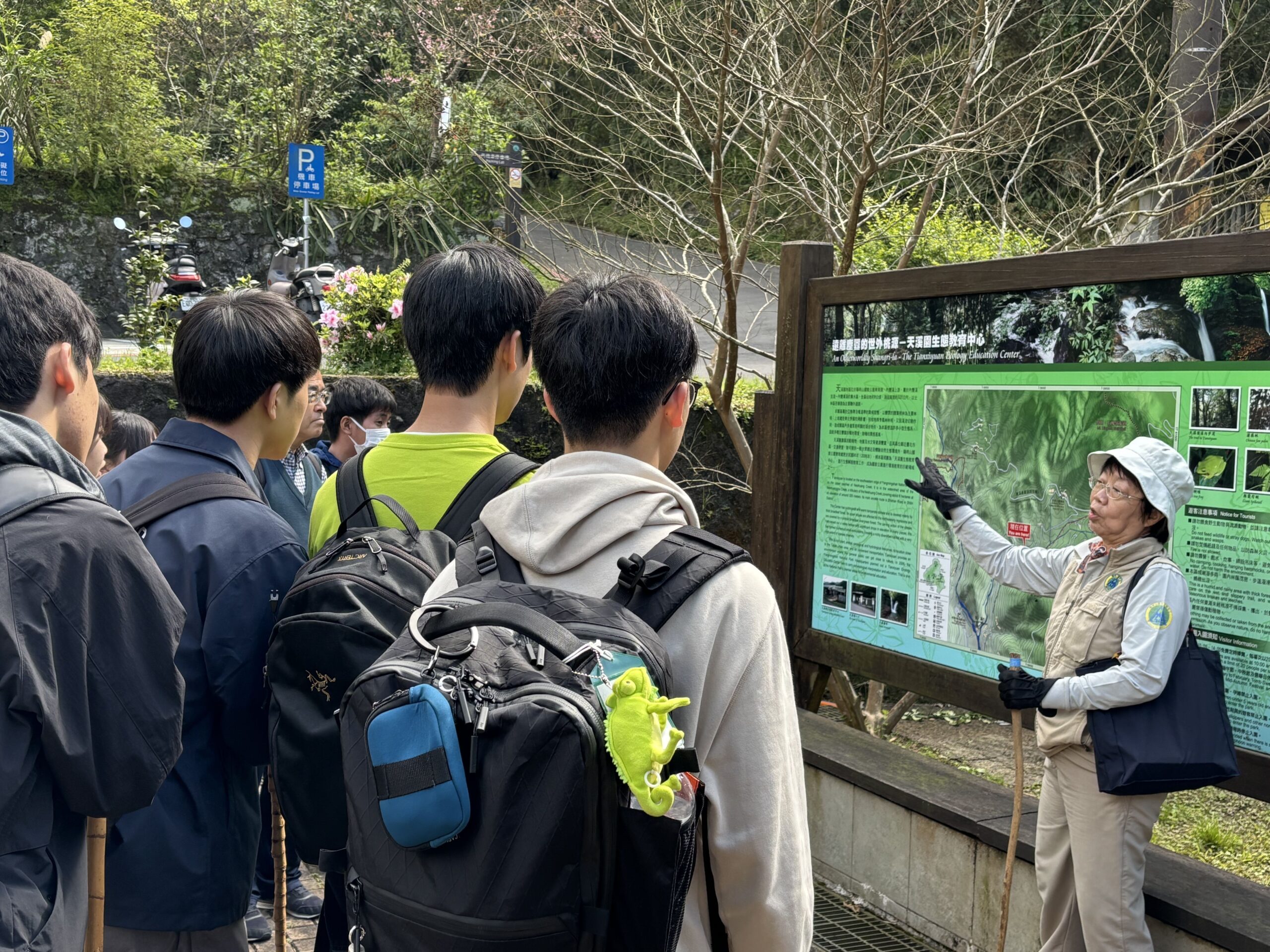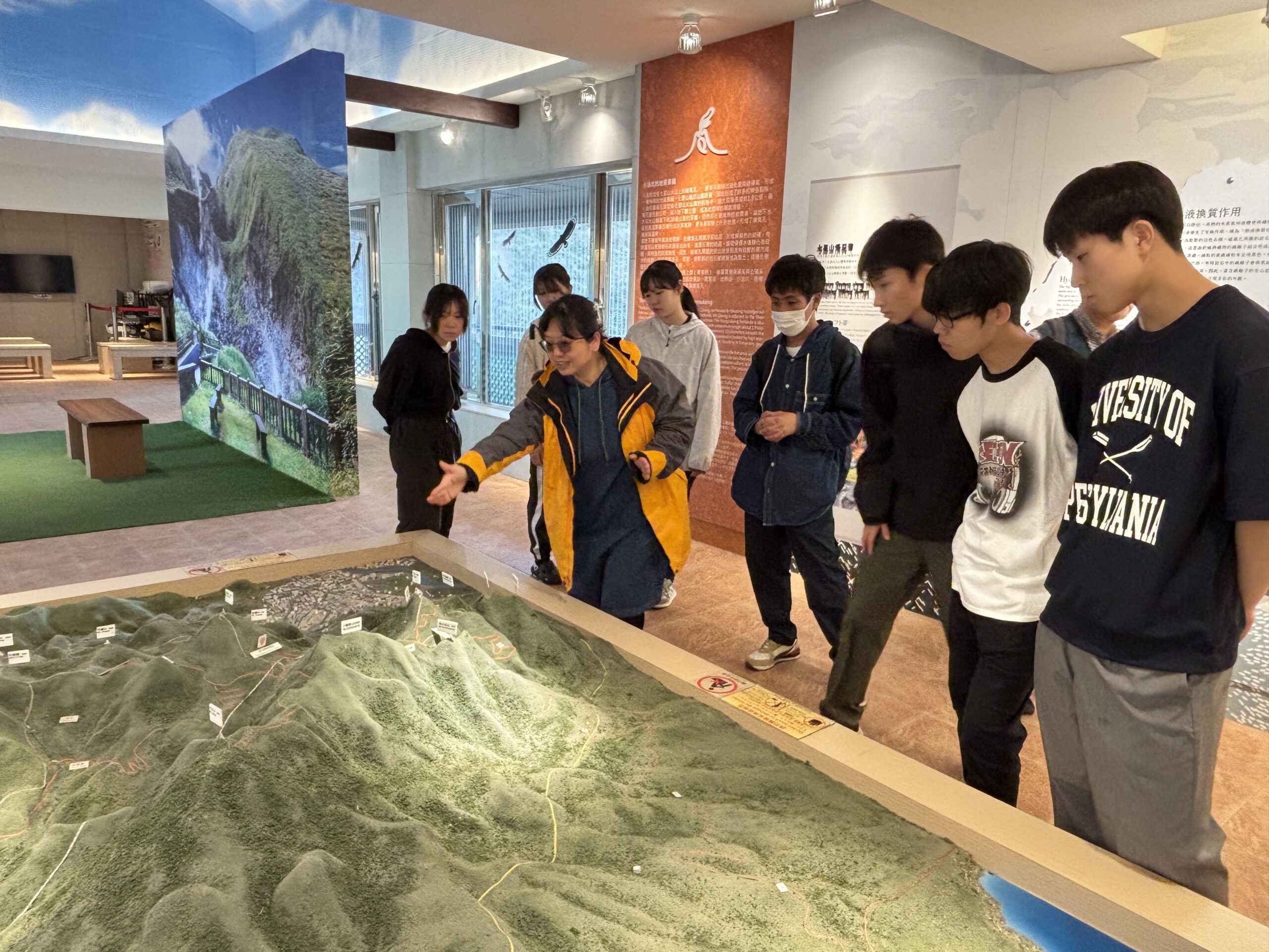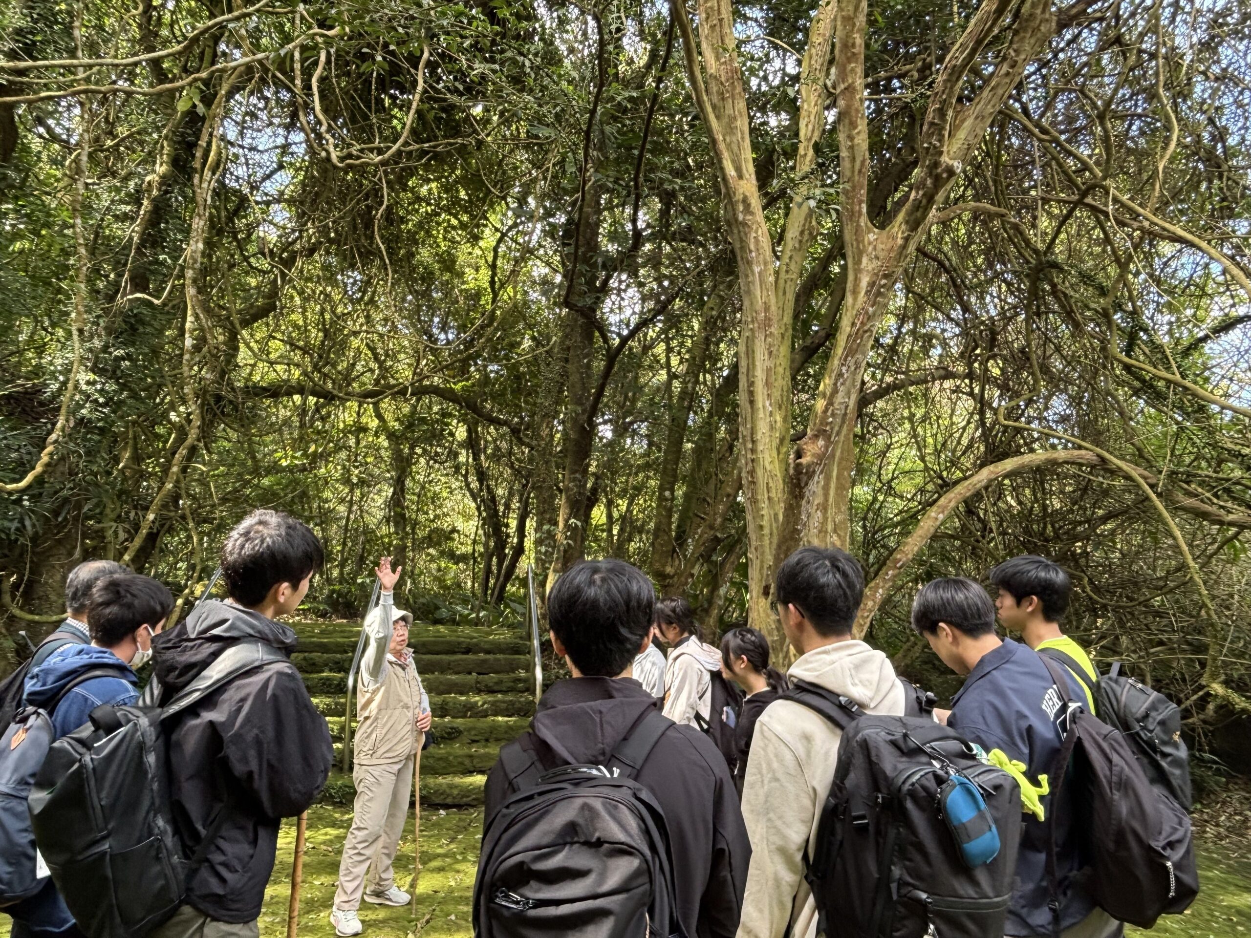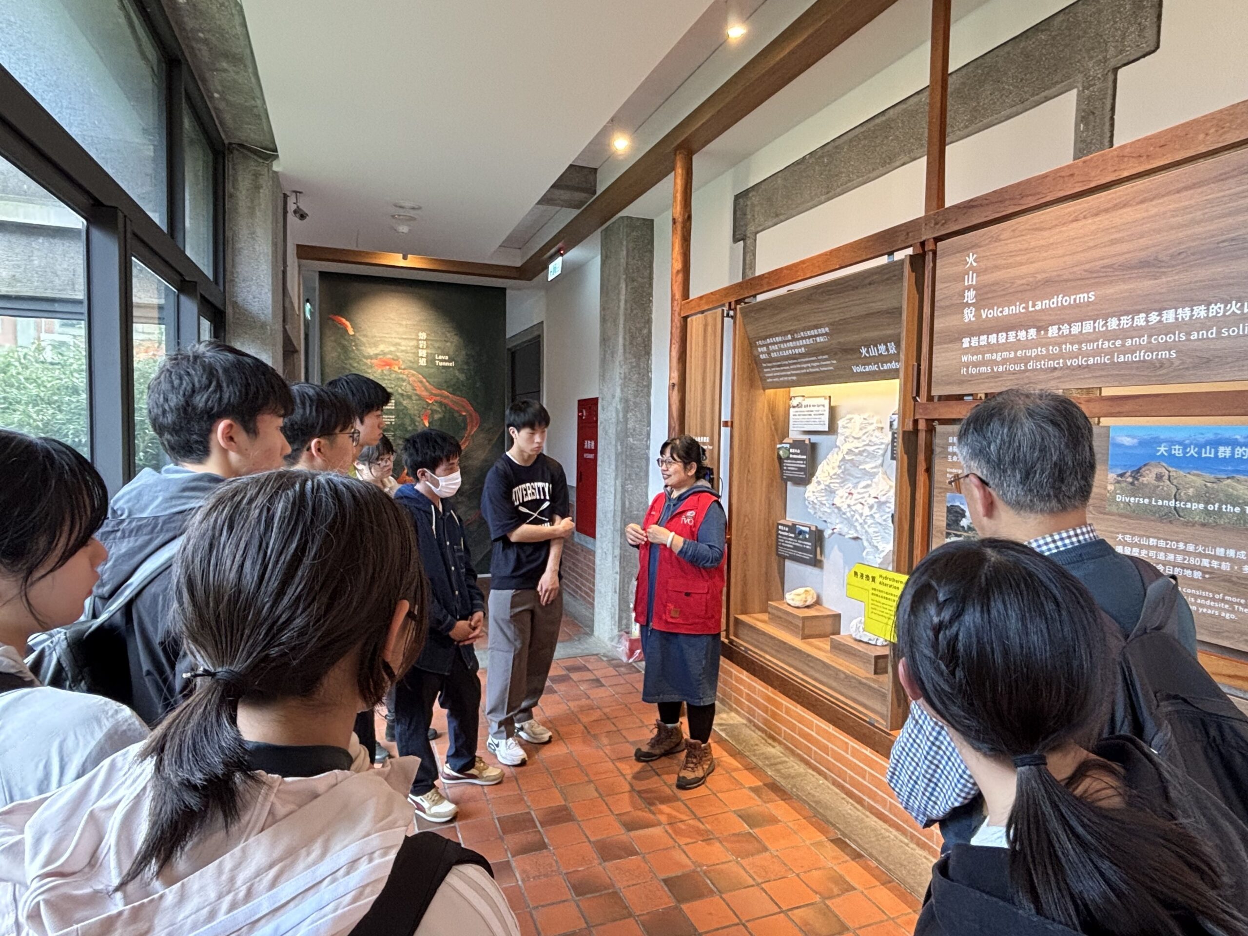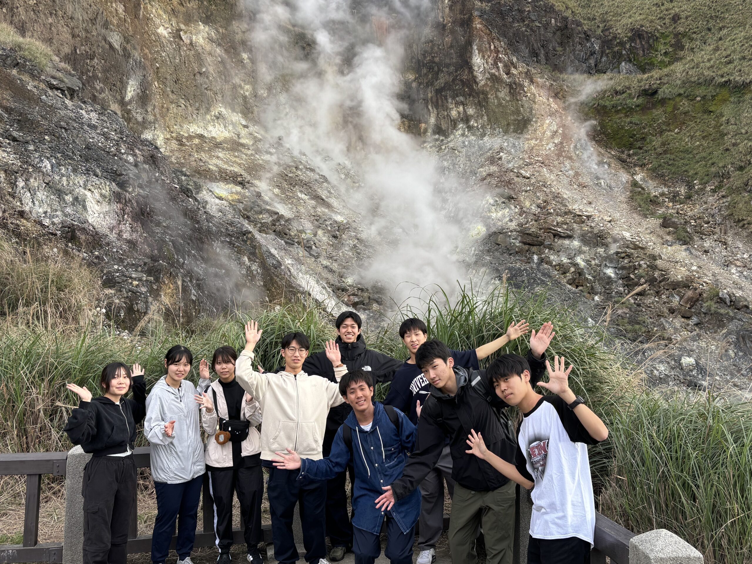 2日目は、ホテルで朝食済ませて、バスで陽明山国家公園に向かいました。現地のガイドさんと合流してフィールドワークの開始です。現地の植生に詳しいガイドさんの解説を聞きながら、台湾固有の植生(照葉樹林、亜熱帯多雨林、火山性草原など)を観察して、調査して日本との違いを考察しました。市内のレストランで昼食をとった後は、大屯火山観測所にバスで移動して、研究員の方から火山や地震に関する観測体制や実際の観測内容について講義を受けました。さらに、小油坑(火山の噴気孔)へ移動して野外調査を行いました。生徒たちは、その迫力に驚いていました。前日に国立台湾大学で学習した内容を振り返りながら、台湾の地震や火山について理解を深めることができました。夜は市内レストランで小籠包に舌鼓を打って、ホテルに到着です。明日は最終日です。最後まで頑張りましょう!!