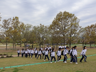 4月13日(月)、心配されていた天気も崩れることなく、新入生歓迎遠足を実施することができました。全学年を縦割りにしたクラス編成で、互いに交流を深めながら、ひまわりの丘公園まで歩いて向かいました。