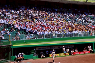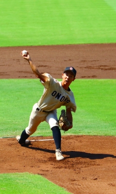 多くの学校では、ユニフォームに学校名が標されているが、小野高校はシンプルに 白地に赤蜻蛉のみ 日の丸のようなデザインである。