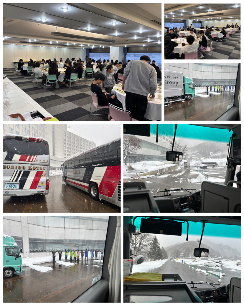 予定通り進み、朝食を食べバスに荷物を積み込み、まずは越後湯沢駅に向かっている所です。