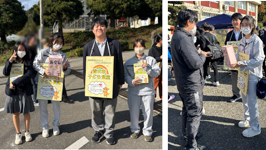 11月に行われた但農祭で生徒会が食について学ぶ但農だからこそできる活動を考え、養父市子ども食堂への募金を行いました。ご協力いただいたお客様に50周年記念キャラクター「たんたん」のステッカーを配布したところ、多くのお客様にご協力していただき、準備していた200枚すべてなくなりました。