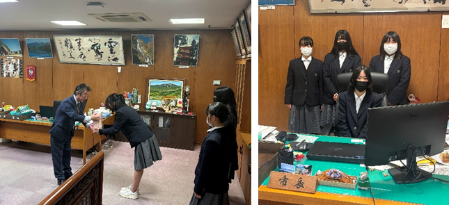皆さまからお寄せいただいた募金は生徒会が養父市役所を訪れ、大林市長に直接手渡しいたしました。受け渡しの後に大林市長、井上副市長と対談する時間を設けていただき、生徒からの「市長の椅子の座り心地は?」という質問には「座ってみますか?」とご提案いただき、実際に座らせていただきました。
