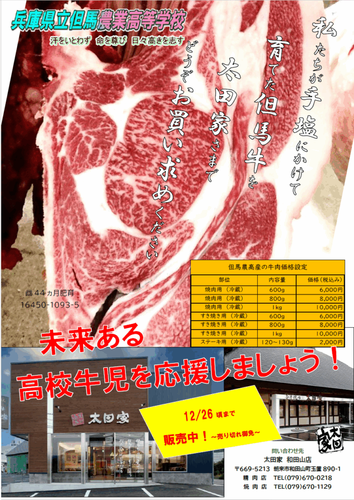 お肉の準備ができ次第「太田家和田山店」にて販売予定です。生徒が愛情込めて育て上げた但馬牛を、ぜひこの機会にご購入をよろしくお願いいたします。