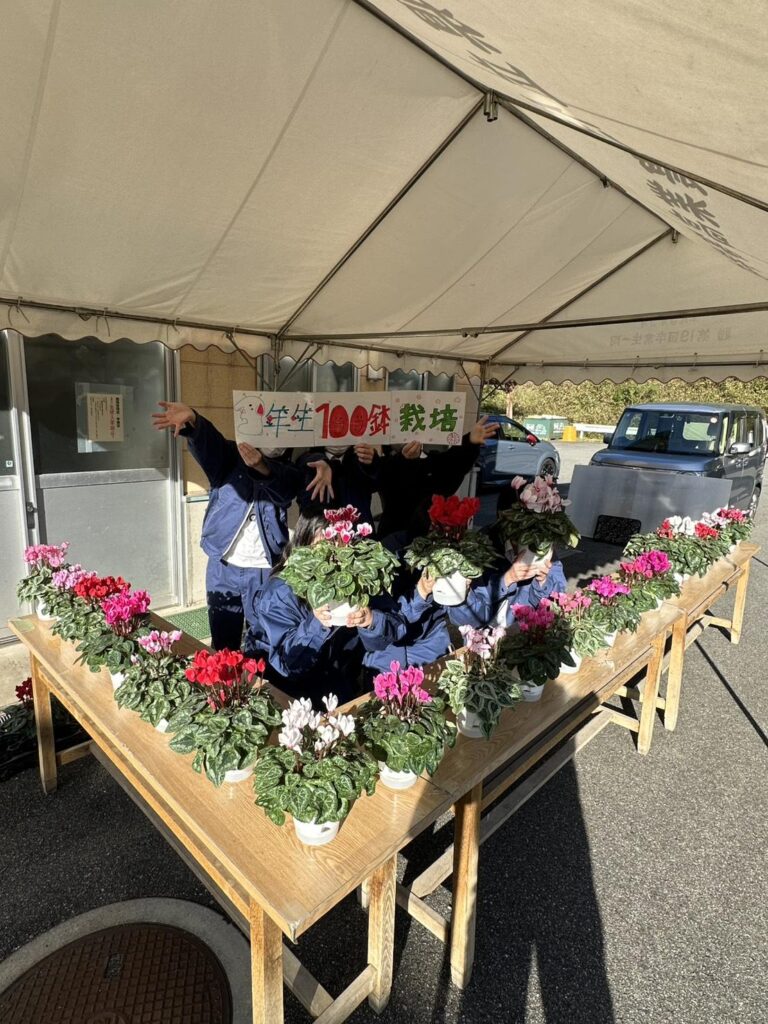 3年生にとっては最後のシクラメン栽培で1人100鉢栽培など責任を持って管理してきました。綺麗なシクラメンに仕上がっています。ぜひご来校ください。