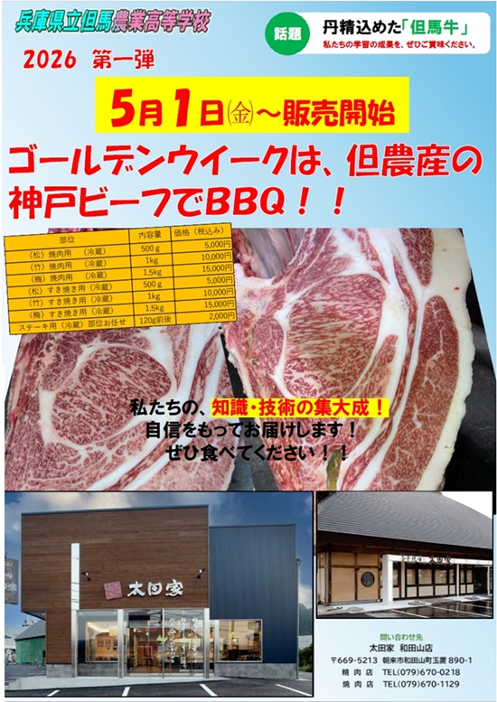 学校産の但馬牛販売のお知らせ 4月11日(土)に但馬牛振興公社において開催された第2回枝肉共励会に出品したお肉が、5月1日(金)より数量限定で「太田家 和田山店」さんにて販売開始となります。ゴールデンウイークは、ぜひ但農産の牛肉でBBQをお楽しみください!
