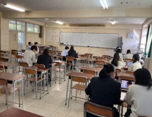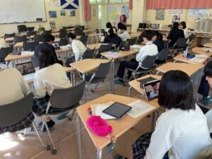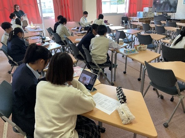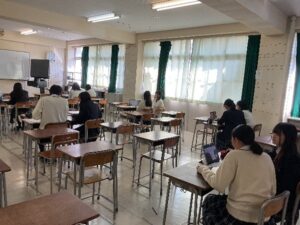 6月に引き続き、韓国のハニョン高校とオンライン交流を実施しました。今回は1年6組LACコースの英会話の授業で、1-6の36名とハニョン高校の28名が参加し、2対1または2対2の少人数同士での交流ができました。1年生は今回がオンラインでの交流は初めてで、一部のペアがzoomのミーティングに入れなかったのは残念でしたが、他のペアに合流してなんとか少し交流できたようでした。