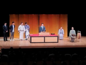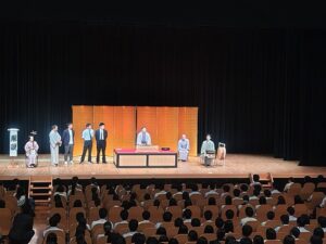 今日は東リいたみホールにて芸術鑑賞会を行いました。今年度は落語を鑑賞しました。米朝事務所の方々に来ていただきました。落語の合間に小道具やお囃子の説明もしていただき、さらに生徒と教員が舞台に上がって、小噺を体験させていただきました。