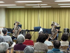 楽器紹介を含め、フルート・オーボエ3重奏、クラリネット3重奏、金管3重奏、チューバ2重奏、打楽器3重奏で5曲を披露し、最後には全員で「手のひらを太陽に」を合唱して終わりました。