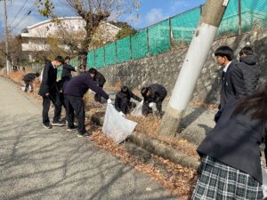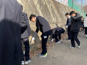 12月11日(木)は2学期期末考査の最終日でした。考査の後、1年生の3クラスが「県立高校ふるさと共創プロジェクト」の一環として、地域清掃を行いました。通学路となっている近隣マンション周辺の歩道や、学校の隣にある「ゆずりは公園」でゴミや落ち葉を拾いました。近隣の皆さまが定期的に清掃活動を行ってくださっているので、ゴミはほとんど落ちていないのですが、落ち葉が多くあり、熊手を使いながら生徒たちがきれいにしてくれました。