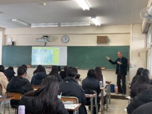 12月18日(木)第2~4校時、2年生LACコース・フランス語選択の授業に、関西フランコフォニーフェスティバルin 神戸実行委員会事務局長の西口信吾さんがお越しくださいました。