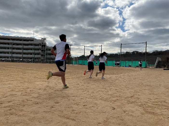 宝塚西高校では毎年3学期になると体育の授業で持久走が始まります。1月末にはマラソン大会も実施されます。早速、今日の授業から1・2年生の持久走が始まりました。「走りたくない!」「寒い!!」という声があちこちから聞こえてきますが、授業の時間は容赦なくやってきます。念入りな準備運動の後、全員半袖になってグラウンドを走っていました。