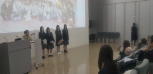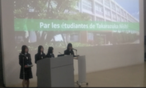 本校生徒は、”Notre école et notre ville » (「私たちの学校・私たちの街」)と題して、 学校の紹介と、宝塚にゆかりのある歌劇とフランスとの繋がりについて、フランス語で披露しました。会場には、フランス、ベルギー、コンゴ、モロッコの在日外国公館代表の方々をはじめ、フランス語を指導されている多くの教育関係者の前で堂々と発表することができました。