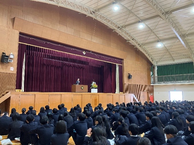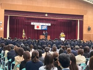 正門前の桜が美しく咲き誇る中、1学期の始業式が行われ、新しい学年がスタートしました。朝、体育館に生徒たちが集まり、静かな雰囲気の中で始業式が始まりました。