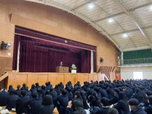 また、校訓である「捨身」についてのお話もありました。「捨身」とは、自分のことだけでなく、他者や社会のために尽くす心を意味します。一見すると馴染みの薄いこの校訓は、実は、学校が位置する「ゆずりは台」の地名の由来である「ゆずり葉」の木に由来しているそうです。新しい葉が育つために古い葉が静かに役目を終える、ゆずり葉の姿になぞらえ、その精神を大切にしたいという思いから「捨身」が校訓として選ばれたそうです。校歌と校訓についてのお話を通して、本校の歴史と受け継がれてきた思いを知ることができました。
