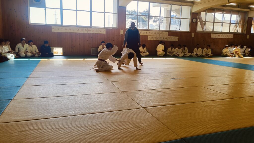 校内をご案内しながら、ジャズバンド部の演奏、茶華道部によるお抹茶とお菓子のおもてなし、書道室での簡単な書道体験、柔道部による柔道体験などを通して、日本の文化を体験していただきました。