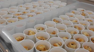 | 活動内容 | 6月の文化祭では、サクサクチョコパイとジュースを、230食販売しました。7月に行われるチャリティコンサートでも、焼き菓子の販売を予定しています。(画像は文化祭の様子です) 4月からの通常の部活では、いちご大福や、韓国のお菓子「黒糖くるみホットク」などを作りました。 毎週楽しく活動しています。 | ||